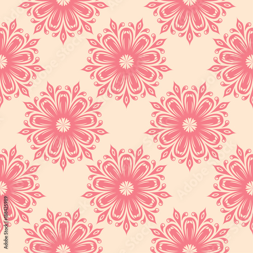 © Liudmyla, Obraz premium Red flowers on beige background. Ornamental seamless pattern