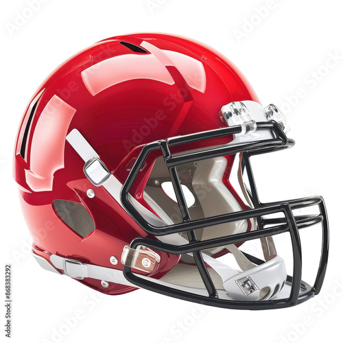 © JR-50, Fototapeta premium Red football helmet with protective face guard isolated on white background, high-resolution image for sporting events or equipment use.