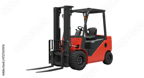 © Luke, Fototapeta premium Red forklift truck isolated on transparent background, industrial vehicle for lifting and transporting heavy loads PNG