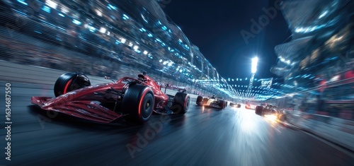 Naklejka premium Red Formula 1 race car leads pack at night, blurred motion showing speed and...