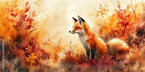 © NpicArt, Obraz premium Red Fox Amidst Autumnal Foliage Watercolor Painting