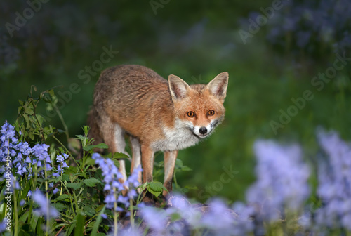 Fototapeta premium Red fox amongst bluebells in spring