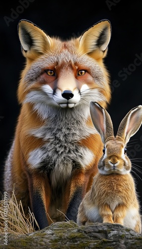 © Ilja, Obraz premium Red Fox and European Rabbit A Study in Contrast, Wildlife Portrait on Black Background