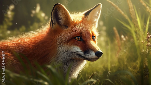 © tanyastock, Fototapeta premium Red fox animal in green grass. Outdoor omnivorous mammal in wildlife. Animal in the field. Generative AI