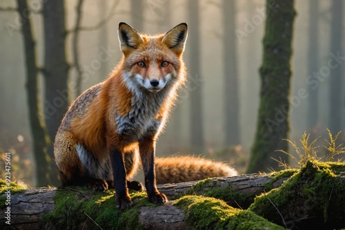 Naklejka premium Red Fox Animal in natural environnement, morning misty sunlight