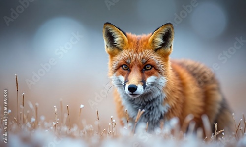 © junet, Obraz premium Red fox close up portrait frosty grass winter
