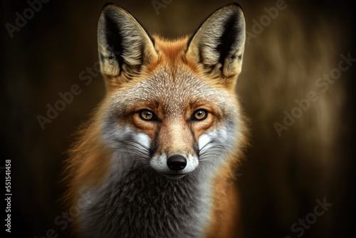 © Katynn, Fototapeta premium Red Fox - close-up portrait with bokeh of pine trees in the background. Making eye contact. Digital art