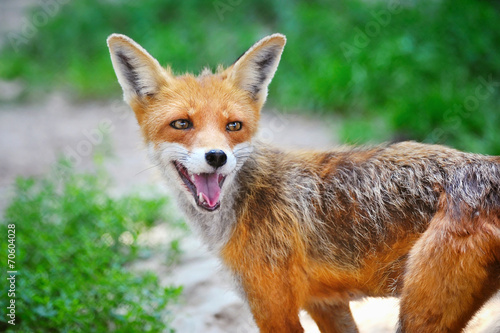 Fototapeta premium Red Fox Cub in grass. The animal smiles