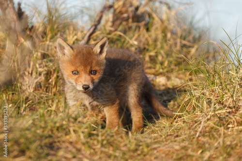 © Menno Schaefer, Naklejka premium Red fox cub in nature at springtime on a sunny day.