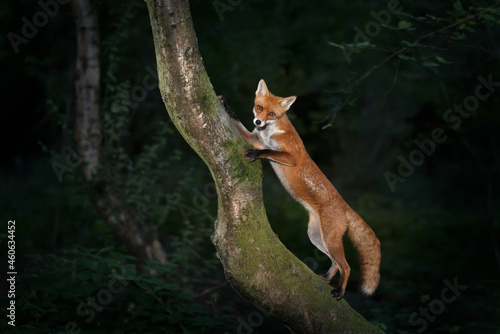 © giedriius, Naklejka premium Red fox cub standing on a tree in forest