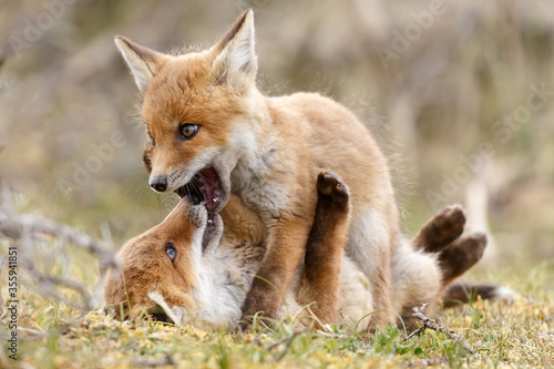 © Menno Schaefer, Fototapeta premium Red fox cubs new born in springtime.