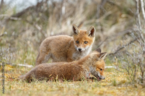 © Menno Schaefer, Naklejka premium Red fox cubs new born in springtime.