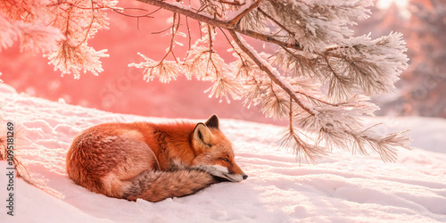 Obraz premium red fox curled up in the snow under a frosted pine tree, soft focus with a...