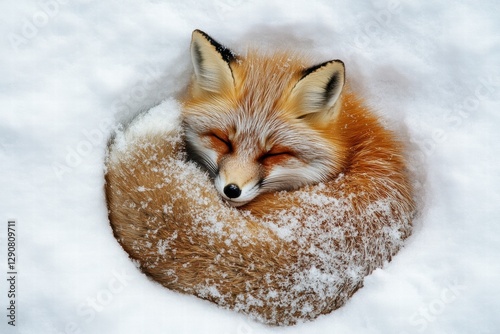 © Dimass, Fototapeta premium Red fox curled up sleeping in the snow
