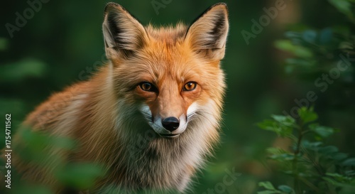 © Hungarian, Fototapeta premium Red fox emerges from lush green forest foliage with bright, alert eyes.