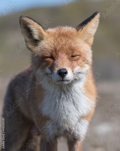 Fototapeta premium Red fox enjoys the sun, photographed in the dunes of the Netherlands.