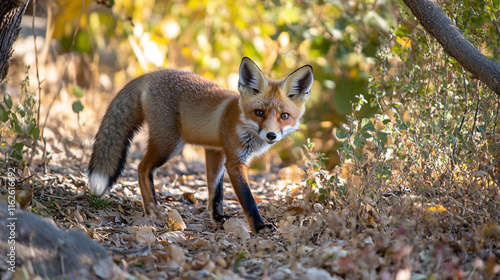 © Sadia, Naklejka premium Red fox explores woodland habitat during golden hour in autumn