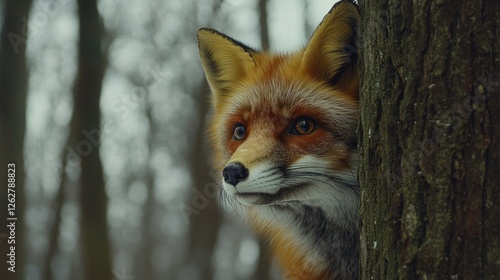 © MABRUR, Obraz premium Red Fox Hiding Behind Tree in Snowy Forest