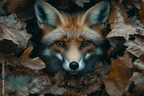 Fototapeta premium Red fox hiding in autumn leaves, wildlife portrait
