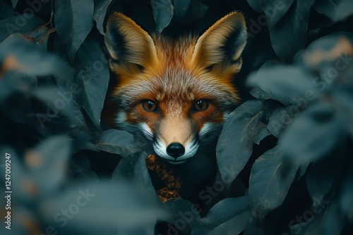 Fototapeta premium Red fox hiding in the bushes, observing surroundings