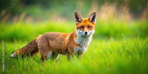 © Sujid, Fototapeta premium Red fox hunting in a lush field, predator, wildlife, nature, outdoor, mammal, hunting, wilderness, bushy tail, furry