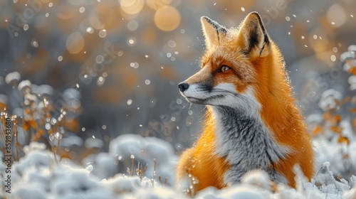 © Adi, Fototapeta premium Red Fox hunting, Vulpes vulpes. Orange fur coat animal in the nature habitat. Fox on the winter forest meadow, with white snow