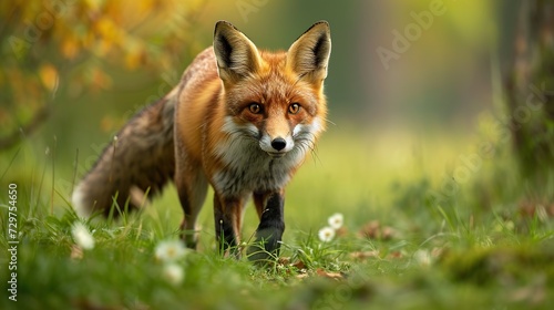 © Naknakhone, Obraz premium Red Fox hunting, Vulpes vulpes, wildlife scene from Europe. Orange fur coat animal in the nature habitat. Fox on the green forest meadow. copy space for text.