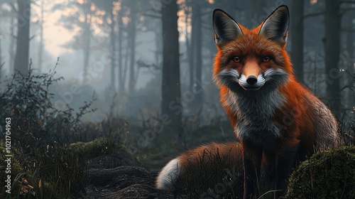 © Anna, Fototapeta premium Red fox in forest, alert expression
