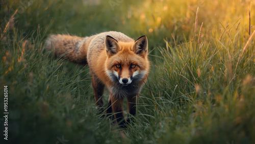 Obraz premium Red fox in golden grass at dusk with attentive gaze