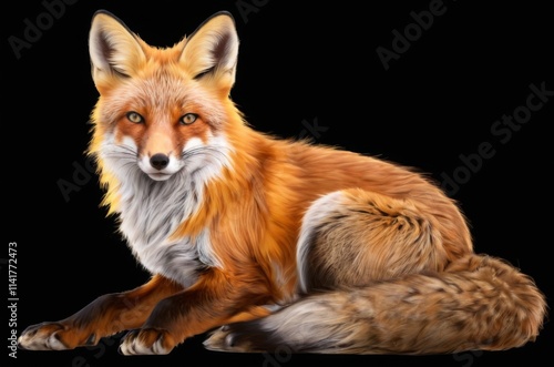 Fototapeta premium Red fox in repose on black background, gazing directly at viewer with yellow...