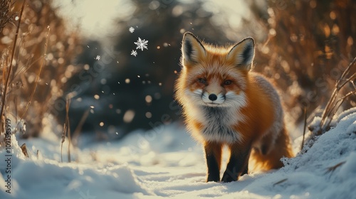 Fototapeta premium Red fox in snow field. Winter theme background template for greeting card...