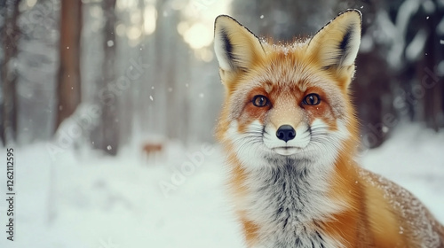 Fototapeta premium Red Fox in Snowy Forest Close-up portrait of a red fox amidst the trees in a winter forest. Its bright fur contrasts with the white snow, capturing the essence of a cold, serene wi