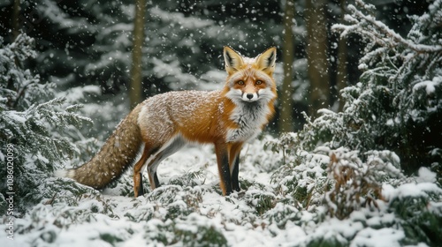 © Роберт Гастон, Naklejka premium Red Fox in Snowy Forest with Dense Evergreen Trees