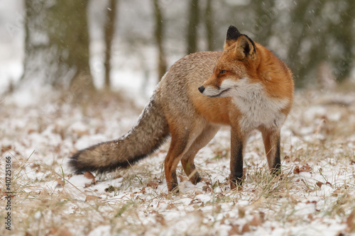 Fototapeta premium Red fox in snowy weather during a winterday.