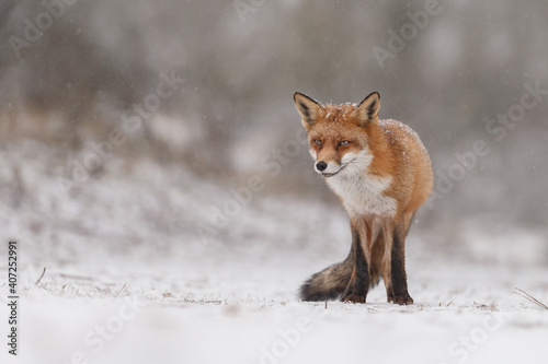 Obraz premium Red fox in snowy weather during a winterday.