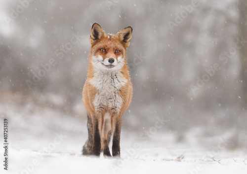 Fototapeta premium Red fox in snowy weather during a winterday.
