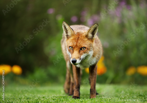 Fototapeta premium Red fox in the garden with flowers