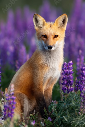 © Iryna, Fototapeta premium Red fox in vibrant purple lupine field