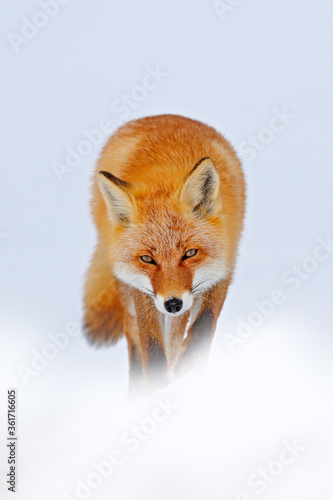 Obraz premium Red fox in white snow. Cold winter with orange fur fox. Hunting animal in the...