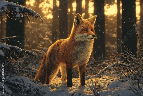 © YONG, Obraz premium Red Fox in Winter Wilderness. A fox with vibrant fur standing in a snowy forest under dappled sunlight. Used for wildlife documentaries, conservation campaigns, or seasonal art.