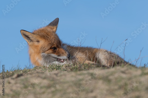 Fototapeta premium Red fox is relaxing in the dunes, photographed in the Netherlands.