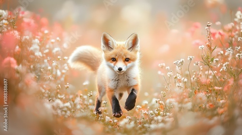© Nuttapong, Obraz premium Red Fox Kit Running Through Flowers.