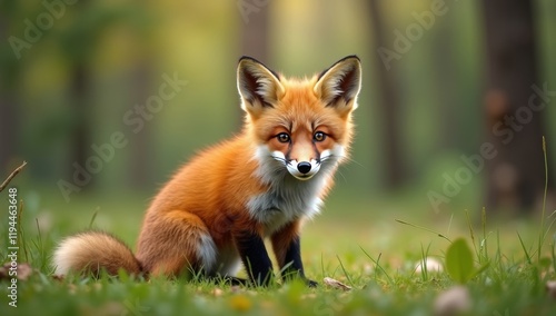 © ekalaila, Fototapeta premium Red Fox Kit Sitting in Forest Grass