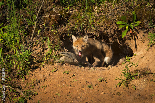 Fototapeta premium Red Fox Kit (Vulpes vulpes) Crawls Out of Den