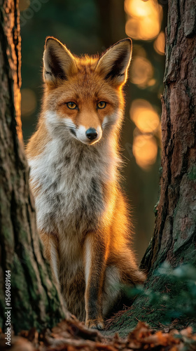 © tohceenilas, Fototapeta premium Red fox looking alert in forest with soft morning light creating serene atmosphere