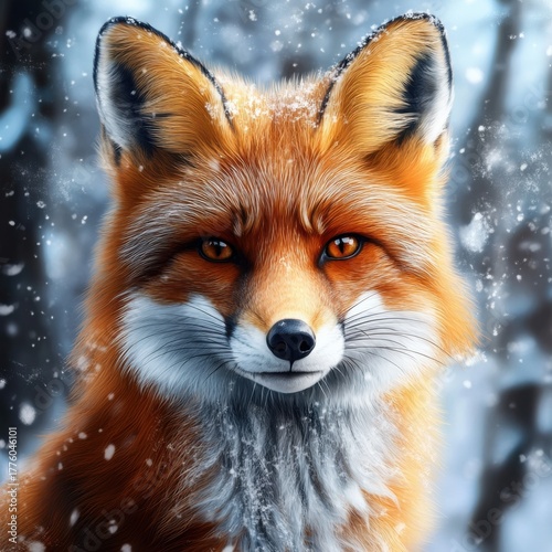 Obraz premium Red fox looking at camera in snowy forest during winter daytime