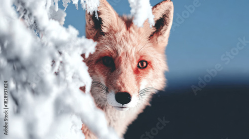 © Bonsales, Naklejka premium Red fox looking directly ahead, partially hidden by snow covered branches against a blue sky, reflecting winter wildlife