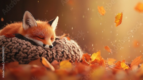 © Anna, Fototapeta premium Red fox on blanket with leaves falling from sky