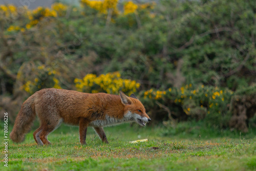 Fototapeta premium Red Fox or Vulpes vulpes close-up, Image shows the lone fox on the edge of a park on the outskirts of London with a Industrial estate in the background