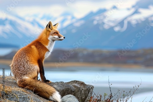 Obraz premium Red fox overlooking Lake Clark State Park, Alaska